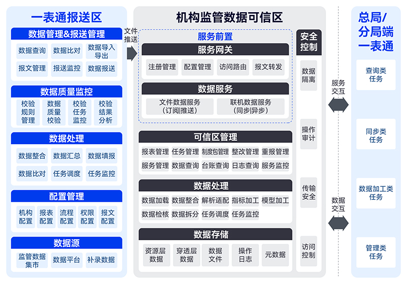 屏蔽底層技術細節:通過服務前置提供標準的服務接口,打通監管端和機構監管可信區,從而屏蔽機構端的底層存儲和技術差異,實現服務交互和數據交互。