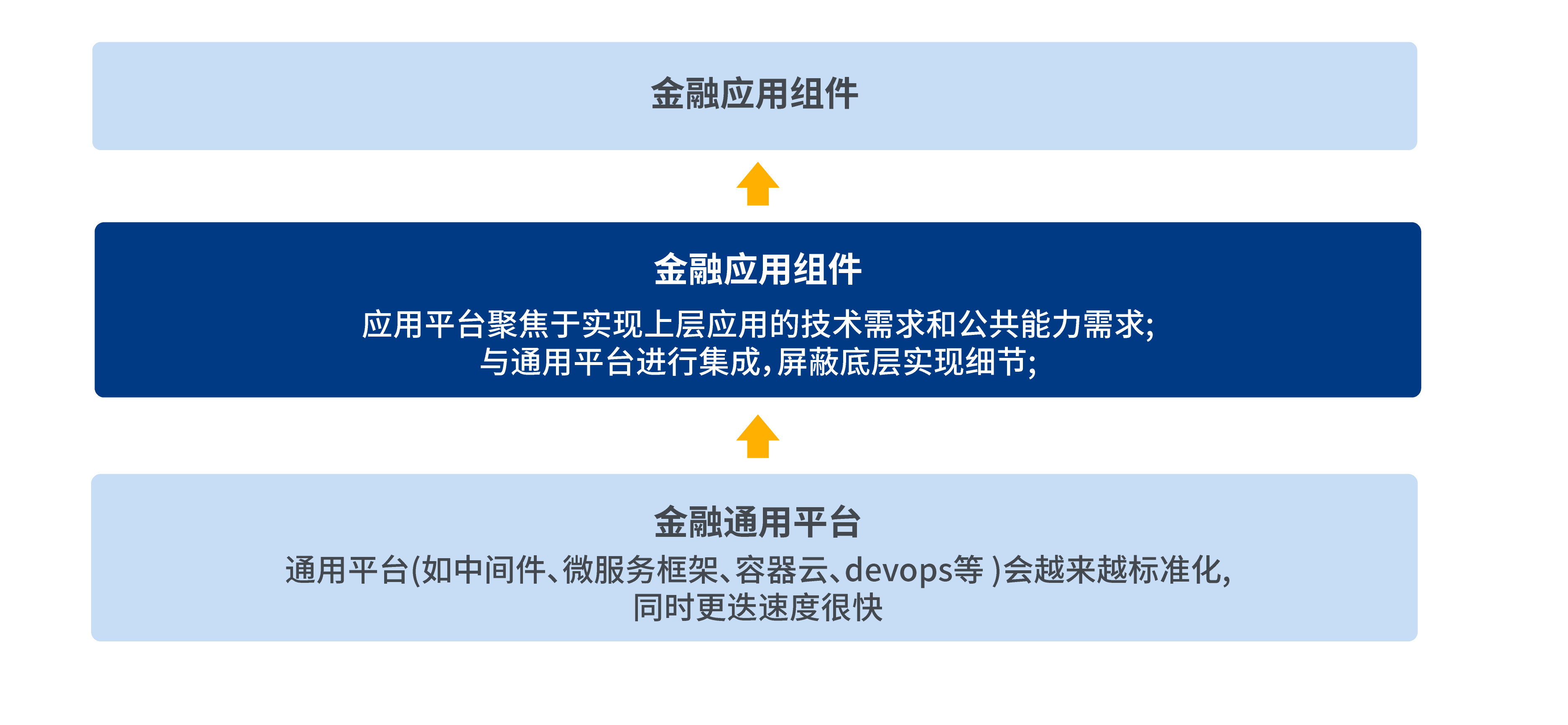 在新一代金融應用平臺演進中,通用平臺(包括中間件、微服務框架等通用類組件)與應用平臺(面向金融應用的開發運行框架和公共能力)的分離已經成為一種趨勢。因為專業性、擴展性、演變路線和解決問題域的不同,應用平臺將更聚焦于應用場景業務知識的沉淀(公共能力下沉),未來也有可能逐步演變成應用中臺,而通用平臺更關注企業級可復用組件,或逐漸演變成技術中臺。